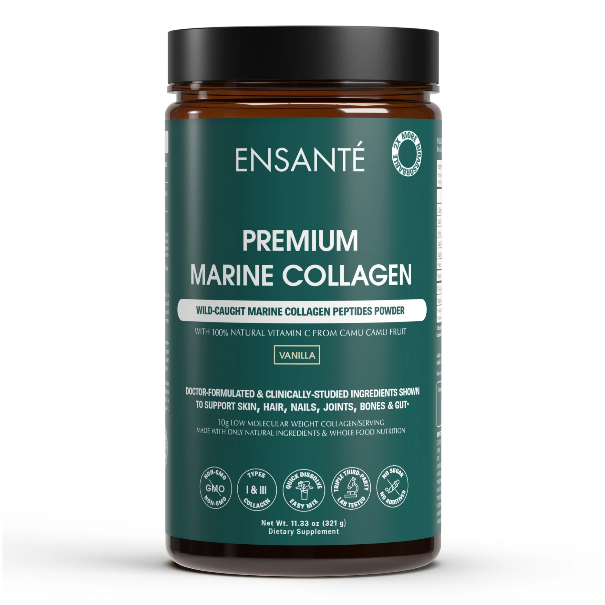 Marine collagen is almost always Type I collagen (85–90%), which is the most abundant in human skin, tendons, and bones. High‑quality premium variants are wild-caught and hydrolyzed into low molecular weight peptides (~300–500 Da) for superior absorption and bioavailability.