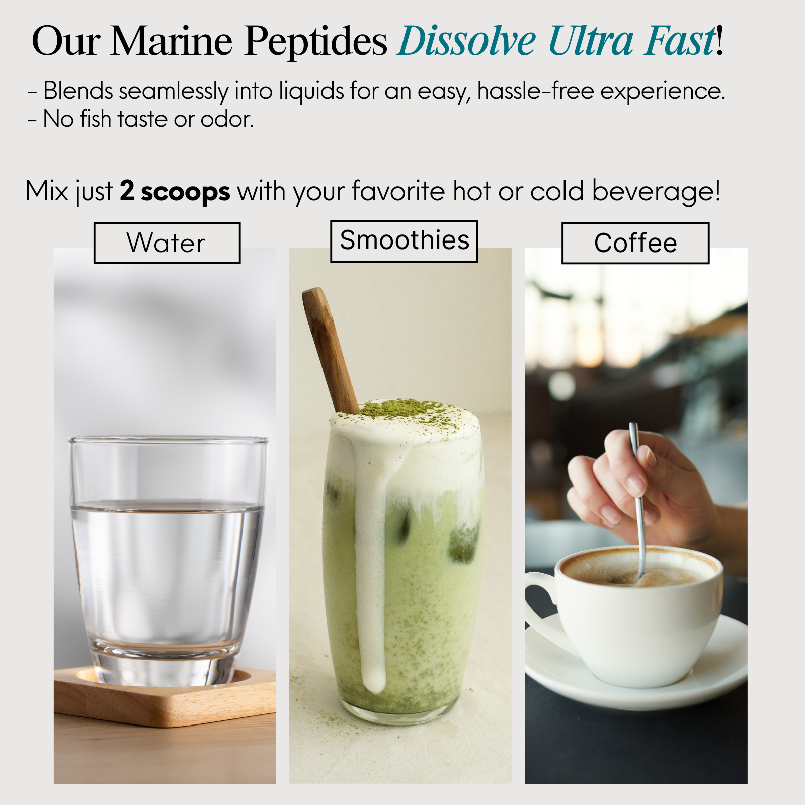 Our collagen supplement is easily digestible and dissolves seamlessly in hot or cold liquids. Simply mix 2 scoops of our Premium Marine Collagen Powder into your favorite foods or beverages, from smoothies to water, for a daily boost that supports healthy hair, skin, nails, and joints.