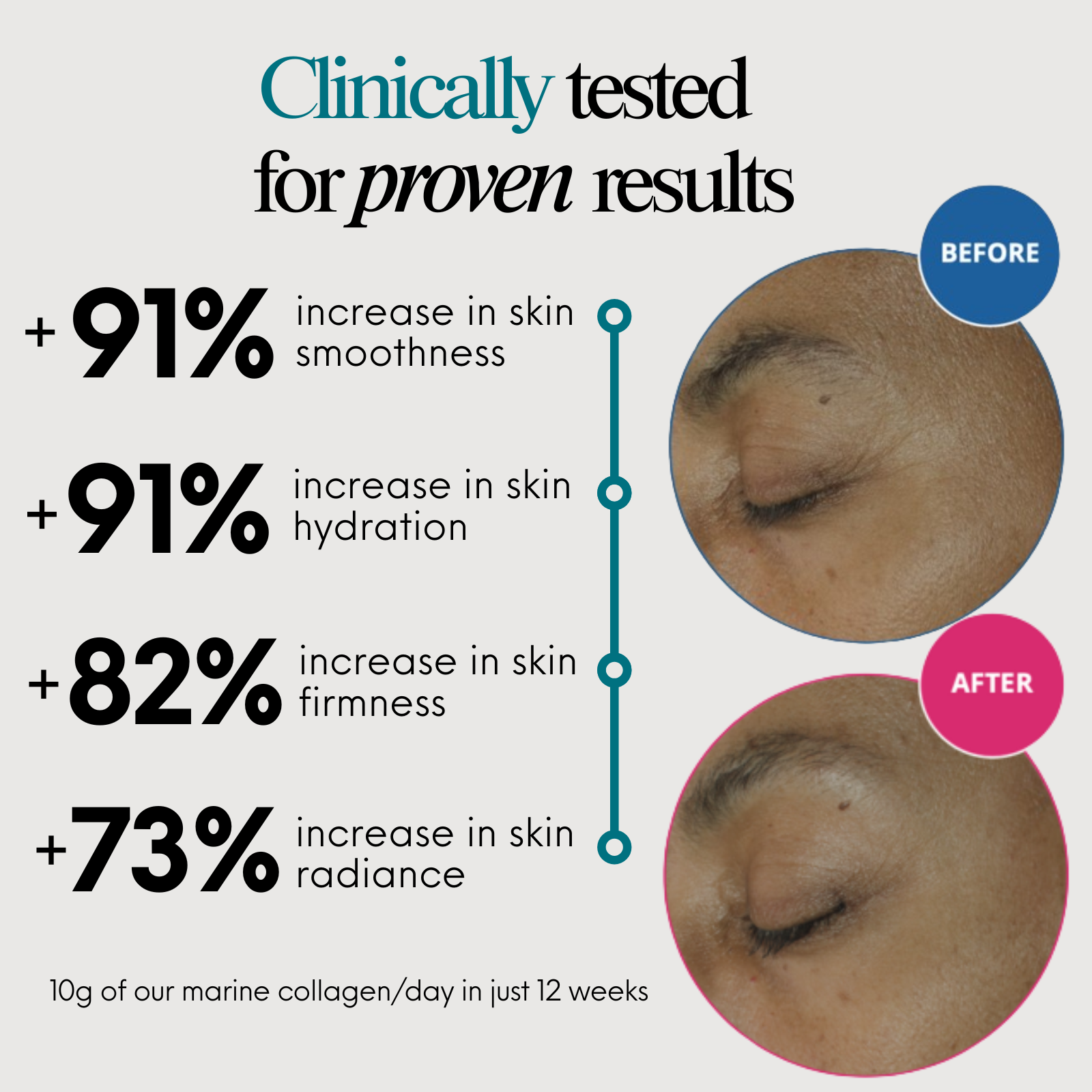 - a 91% increase in skin radiance by 12 weeks at 10g of marine collagen/day