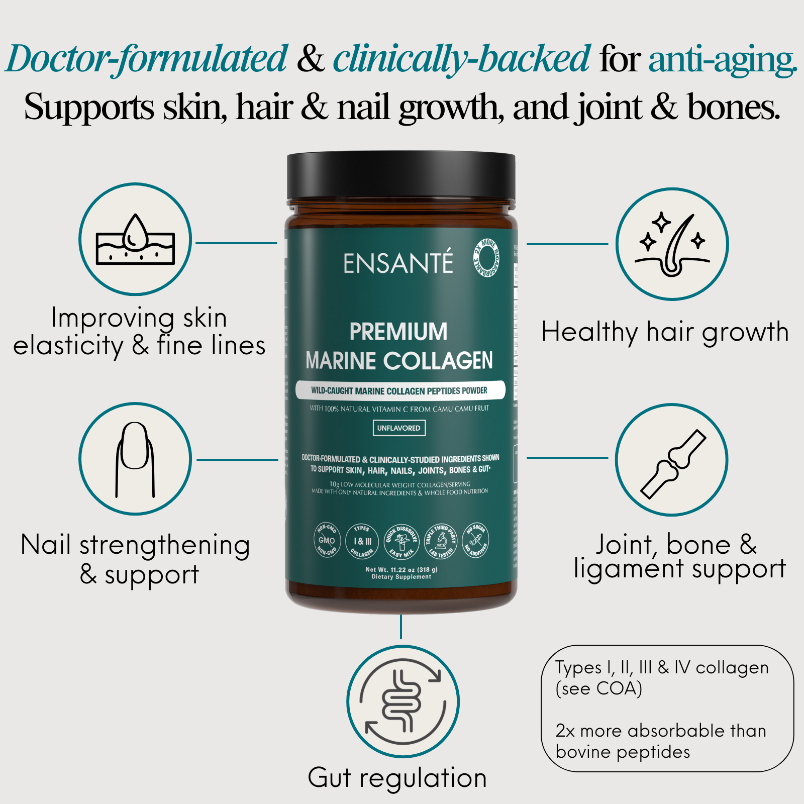 Our Premium Marine Collagen Powder is ideal for those focused on skin elasticity, hydration, hair and nail support, anti-aging support, or joint and bone support. This includes postpartum moms, athletes, or simply anyone over age 25.